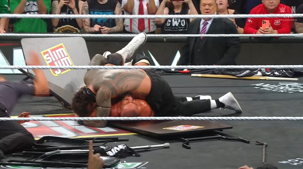 No voy a decir que es una buena lucha, no lo es. Mucho uso de objetos y todo lo que quieras, pero no han hecho nada que genere un mínimo interés. Si no fuera porque aquí ha intervenido hasta el apuntador, como si fuera un combate de Roman Reigns —que, por cierto, también ha aparecido durante la lucha—, no habría nada que comentar aquí. Hemos visto pasearse por aquí a LA Knight, a CM Punk, a Bronson Reed, a Seth Rollins y sí, como decía, a Roman Reigns.