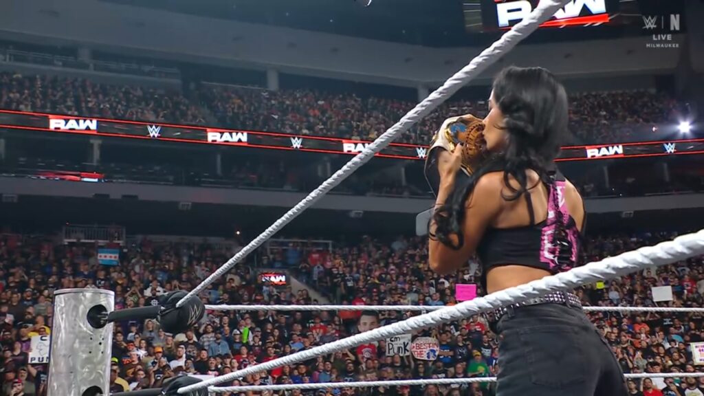 Y este es el momento que estaba esperando todo el mundo. Sale AJ Lee con el título de Becky Lynch en su cintura con total naturalidad, el público la ovaciona y toma un micrófono para hablar. Consciente de que han pasado diez años y WWE tiene público nuevo, pasa a presentarse, para que los nuevos entiendan por qué la gente se ha emocionado tanto por su regreso, afirmando que es la luchadora favorita de su luchadora favorita. En la mayoría de los casos, probablemente sea verdad.